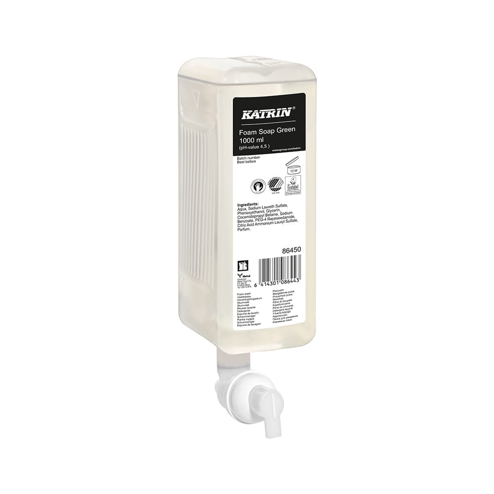 Katrin Tvål 1L Foamwash Green 6 st/krt – En uppfriskande skumtvål med en mild doft av björk. Tvålen har ett rikt och stabilt skum som ger en mjuk känsla och är lätt att sprida på händerna och lämnar mjuka och återfuktande. Tvålen innehåller milda ingredienser för känslig hud och har ett lågt PH-värde så att den är skonsam mot huden, vilket gör tvålen användbar för frekvent användning och är behaglig och mild mot huden. Alla ingredienser har valts ut omsorgsfullt med kvalitet och med minsta möjliga miljöpåverkan i åtanke. Dermatologiskt testad och godkänd. Förpackad i en återvinningsbar behållare.