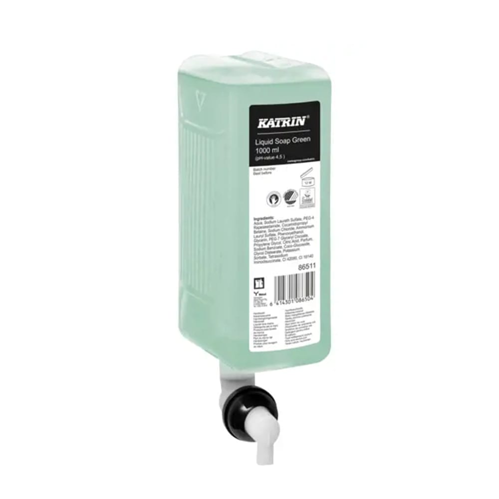 Katrin Tvål 1L Green 6 st/Krt – Samtliga ingredienser har valts ut omsorgsfullt med kvalitet, specifik tillämpning och minsta möjliga miljöpåverkan i åtanke. Pump och patron är förseglade med hjälp av ultraljudssvetsning, vilket förhindrar korskontaminering av bakterier. Rengör händer från lätt smuts med endast en dos. Innehåller glycerin som återfuktar huden och gör den mjuk. Dermatologiskt testad och godkänd. 1L. 6 st/krt