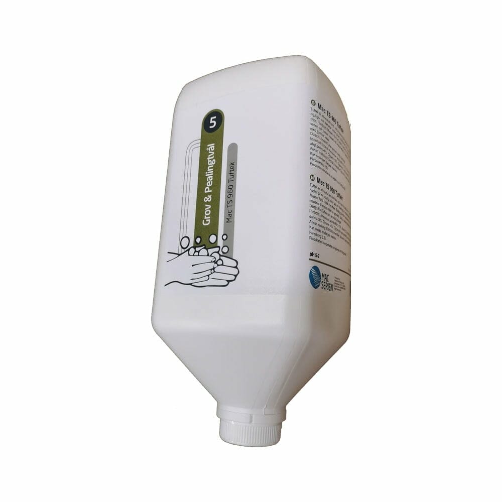 Mac TS 960 Tuftek Grovtvål 2,5L – Ett neutralt flytande hand-och kroppsrengöringsmedel för dagligt bruk. Har en behagligt rengörande effekt och löser de flesta typer av smuts. Mjukgör och återfettar huden på ett naturligt sätt tack vare innehållet av vegetabiliska oljor. Löser effektivt upp olja och smuts med peelingeffekt som sker med hjälp av kokosextrakt. Flaskorna hängs upp på krok och tvålen doseras ut med spena. Dessa säljes separat. 6 flaskor / krt.