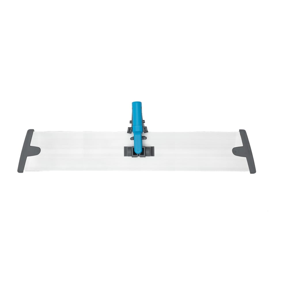 Moppstativ Kleano Pro 60 cm – Högkvalitativt moppstativ tillverkat i eloxerad aluminium med ljusblå detaljer. Ovansidan är helt slät, vilket eliminerar smutsfällor. Kardborren är monterad i skenor på undersidan och kan lätt bytas ut. Quick-snap-leden gör det mycket enkelt att koppla på och av skaft. Leden kan låsas i sidled och rörligheten kan dämpas i fram- och bakled.Möjligheten att låsa stativet i ett läge ger ett större användningsområde för moppningen, t.ex. golvlister, väggar, ventilationskanaler, tak och belysning.