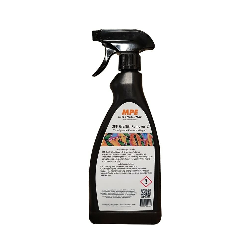 OFF Graffiti Remover 2 Klotterbort 500ml – OFF Graffitiborttagare 2 är en tunnflytande klotterborttagare som löser tusch och sprayklotter. Produkten lämpar sig särskilt för sanering av känsliga ytor som plexiglas och skyltar. Ready for use i 500 ml-flaska med spraymunstycke!