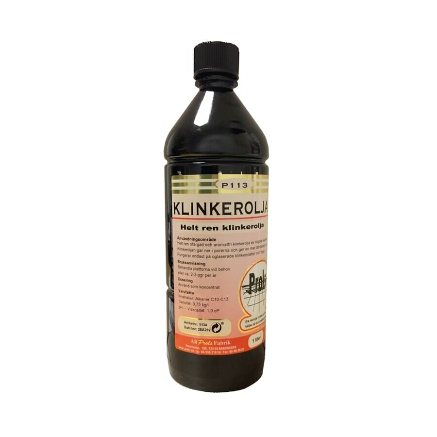 P113 Klinkerolja 1L – Klinkerolja tränger in i porösa ytor och ger en naturlig lyster. Ytan mättas och förseglas så att den blir mindre smutsmottaglig och lättare att hålla ren. Tvätta med målartvätt innan du smörjer på oljan med pensel eller trasa. Klinkerolja ger ett vackert resultat på keramiska plattor, sten och terazzo.