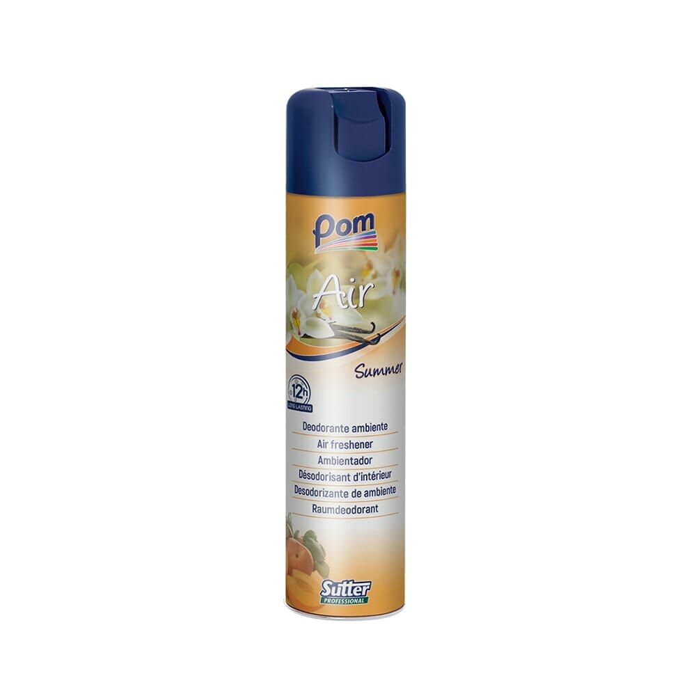 POM Luftfräschare Summer Aerosol 300ml – Med sin långvariga doft och höga koncentration lämnar den en ihållande doft som eliminerar alla obehagliga lukter. Söta och omslutande sensationer, typiska för vanilj, karaktäriserar doften av sommaren. Vi hittar dem i toppnoterna tillsammans med blommiga inslag och i basnoterna med mysk och stenros. Varma och fruktiga bärnstensnoter finns i hjärtat av doften.