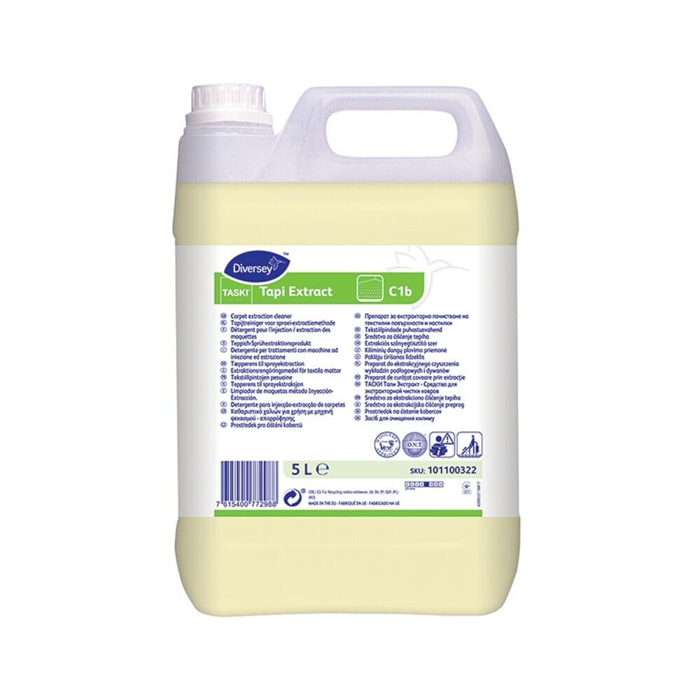 Extraktionsrengöringsmedel för textila mattor och möbler för sprayextraktionsmetoden. Innehåller ‘O.N.T.’ luktneutraliseringsteknologi för effektiv neutralisering av dålig lukt och långtidsverkande parfym.