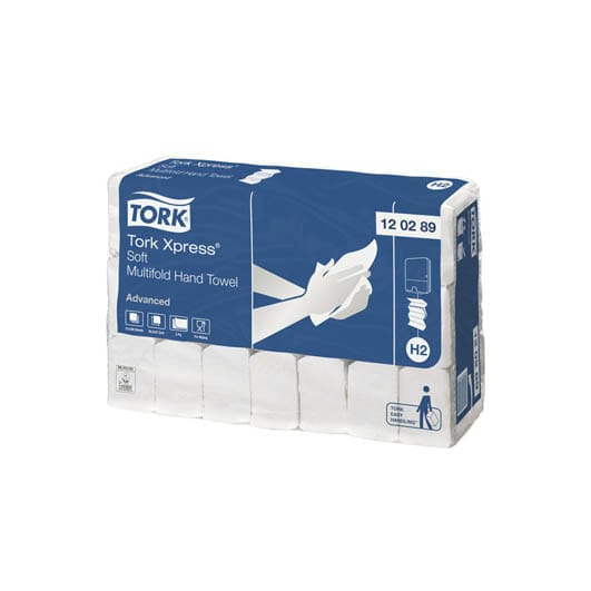 Tork Advanced H2 Kedjevikt Handduk – Med behagliga Tork Xpress® Mjuk Multifold Handduk i Advanced design får dina besökare en bekväm och utmärkt handavtorkning. Handdukarna är skonsamma mot huden och förmedlar en känsla av hög kvalitet. De passar i Tork Xpress® Dispenser Multifold Handduk för toalettutrymmen med medelhög besöksfrekvens. Dispensern får plats i små utrymmen och erbjuder dina gäster både komfort och hygien. 3780 ark/bal.