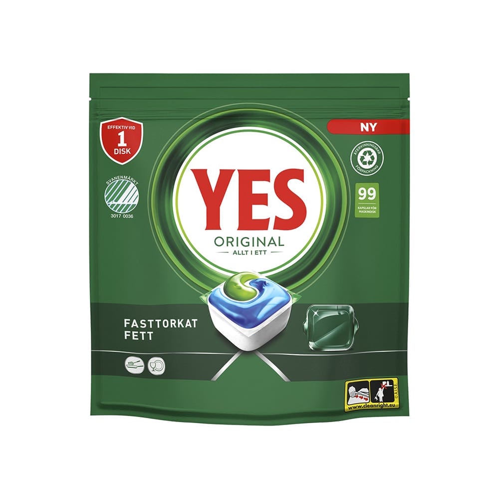 YES Powerdrops All in One Original 99-p- Marknadens populäraste och effektivaste maskindisktabletter i storpack! Disktabletterna tar effektivt bort fastbränt fett och ger ett skinande resultat vid varje diskning. Produkten tar bort tuffa fastbrända fläckar och löser upp fett, även vid låga temperaturer och tabletten löses snabbt upp i maskinen. All-in-one tabletten innehåller även glasskydd, silverskydd kalkskydd och spolglans och är effektiv redan vid första diskningen. Inget plasthölje gör att den kan placeras precis som den är, helt färdigdoserad, i diskmaskinens fack och du slipper klibbiga förpackningar. Ett smart ziplås gör att förpackningen håller borta fukt så att tabletterna håller sig fräscha under diskbänken. Ger resultat även vid korta program med låg temperatur. Svanenmärkt. 99 tabletter per förpackning, 3 förpackningar per kartong.